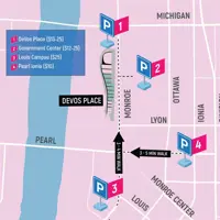 The routes below provide free parking and a convenient bus ride (standard fares apply) with service to DeVos Place. NOTE: The Rapid routes stop running by midnight, please confirm the last ride for your select route.