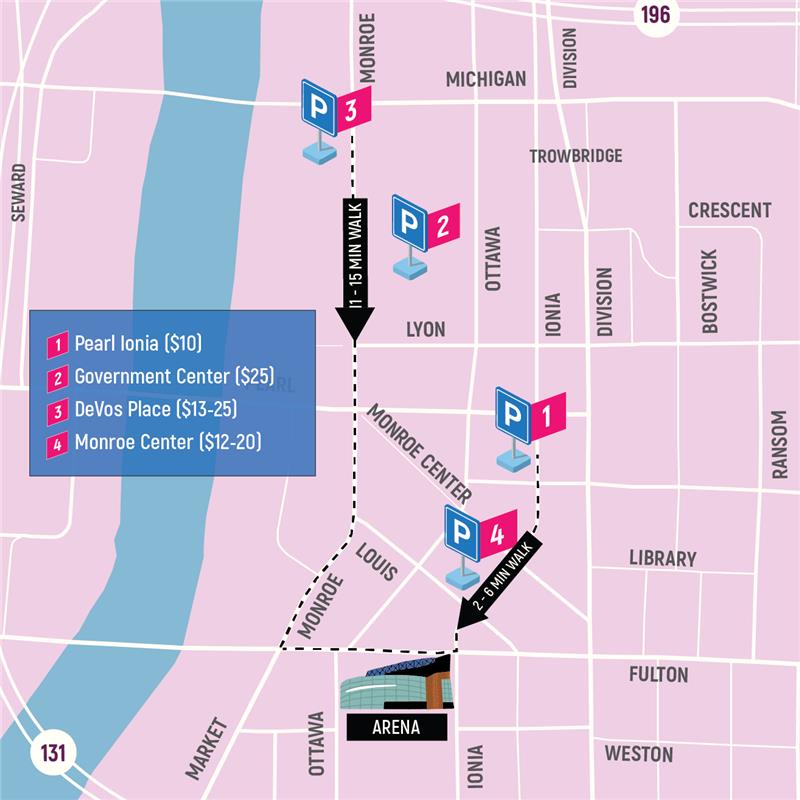 The routes below provide free parking and a convenient bus stop with service to Rapid Central Station (0.4 miles, 9 minute walk to Van Andel Arena). NOTE: The Rapid routes stop running by midnight, please confirm the last ride for your select route.